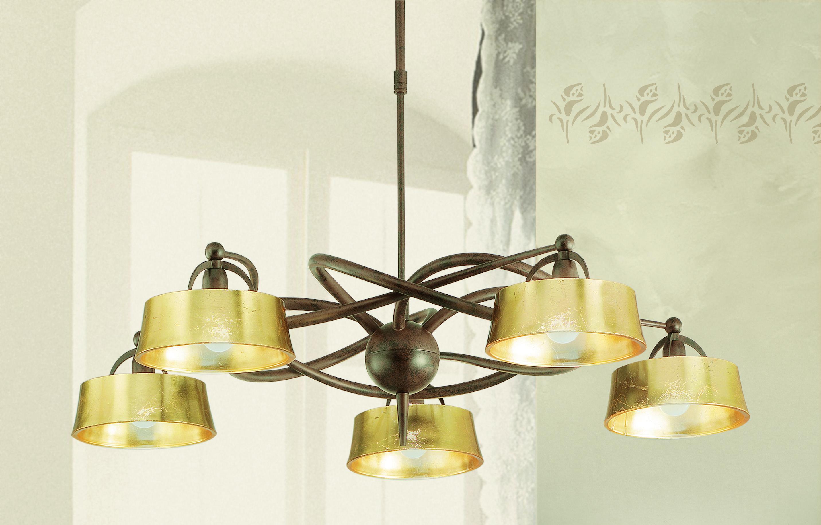 Lustra suspendata cu 5 becuri, prezinta folie din AUR peste fiecare din cele 5 abajururi.
